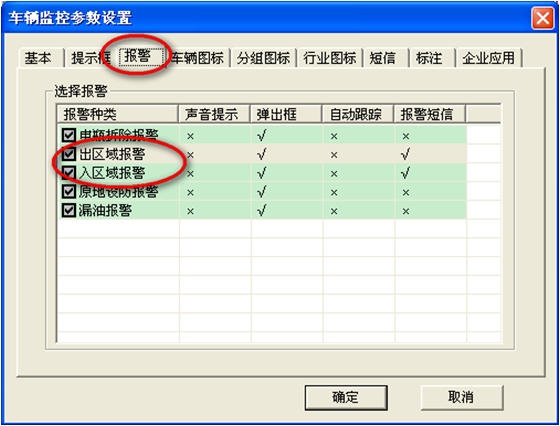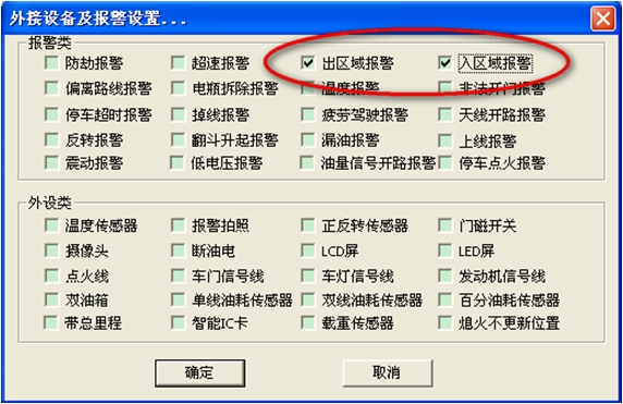 登录客户端,打开车辆窗,右键点击需要设置围栏的车辆,选择“外接设备及报警设置”,勾选报警类“入区域报警”“出区域报警”如图1