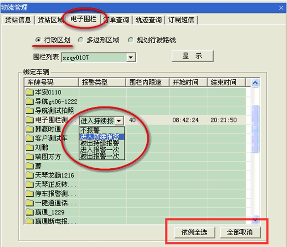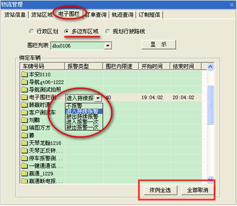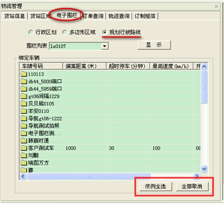 另:通过“依例全选/全部取消”可对全部车辆进行统一设置。
