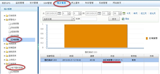 b.通过后台统计报表“报警统计—区域报警”或“区域报表—电子围栏报表/区域报表”查看相关报表数据,如图15