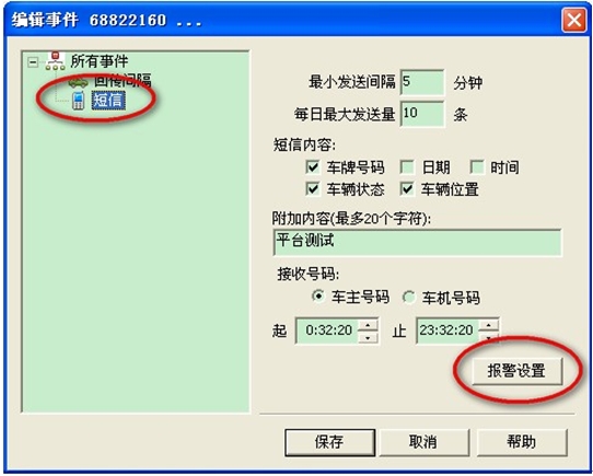 当车辆产生报警信息后,系统自动触发 “事件—短信” 立即向车主发送车辆报警信息内容。