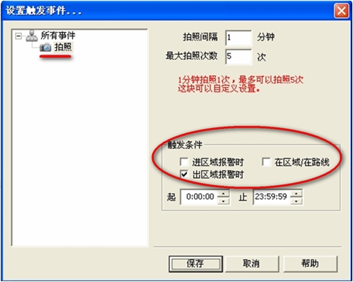 弹出“设置触发事件”对话框,根据用户需要对 触发拍照 事件进行相应设置(如图21)