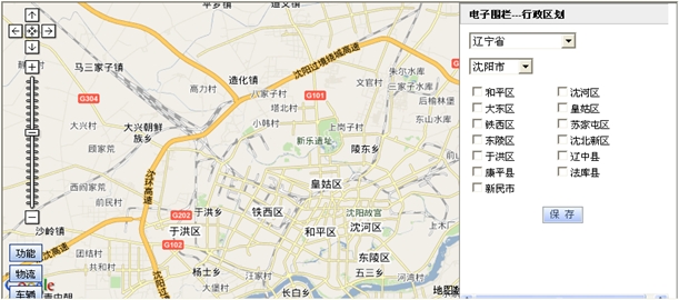 b.在“功能窗:电子围栏---行政区域”目录下,点击刚刚添加的围栏名称,地图右侧即弹出各省市行政区域表,根据需要选择保存即可,如图4:
