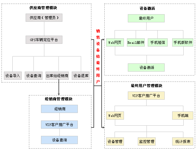 最终用户拿到从供应商或经销商处售出的设备后,通过vip推广平台网页、email邮件、编辑手机短信、安装vip推广平台手机版软件等任意一种方式来激活此设备,设备激活后返回给用户登录账号及密码。用户凭账号密码在vip推广平台网页版,手机版均可以进行设备管理及设备监控,并可查看常用的里程及报警报表。