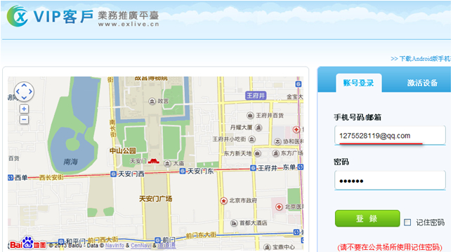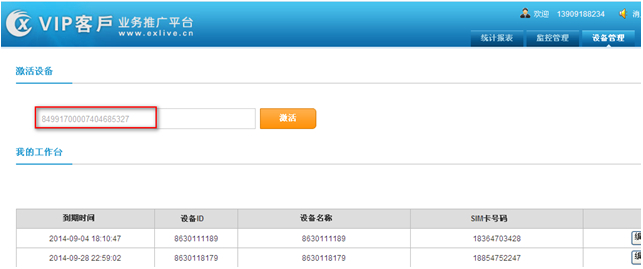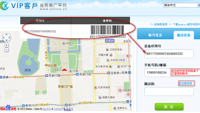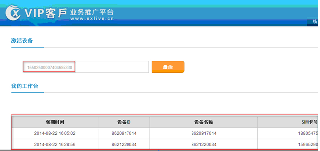 用户登录VIP客户推广平台(vip.exlive.cn)填写要激活设备的序列号、自己的手机号码(为下次登录VIP客户业务推广平台的帐号),点击