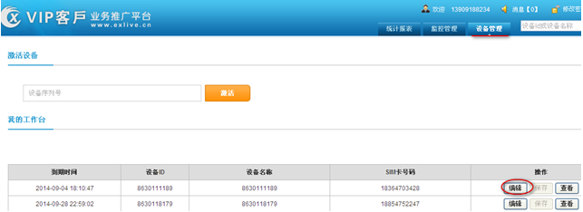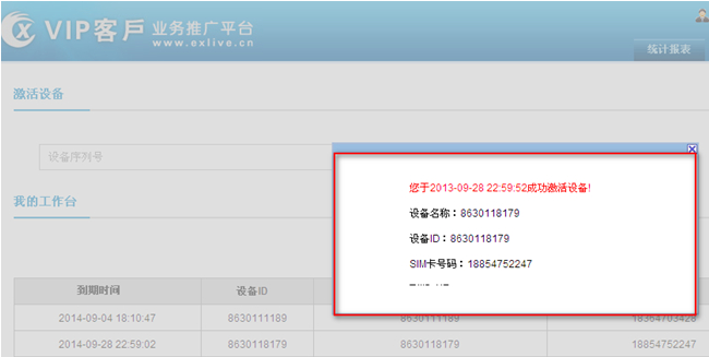 收到系统回复激活成功的短信后,用手机号码和密码登录VIP推广平台,能看到用此手机激活的所有设备列表。