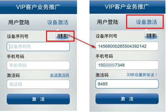 扫描,用手机对准设备上的序列号(条形码)扫描,扫描成功,系统将获取到序列号自动填写至设备序列号处,用户填写自己手机号码,获取并填写激活码,点击“激活”即可