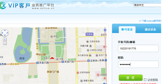 (2)用激活的手机号码,和刚才收到的密码登录VIP推广平台(vip.exlive.cn)