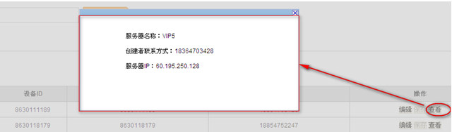 点击查看按钮,可以看到上级供应商(或者经销商) 设备导入的服务器名称及服务器ip,以及供应商(或者经销商)的联系方式。如下图