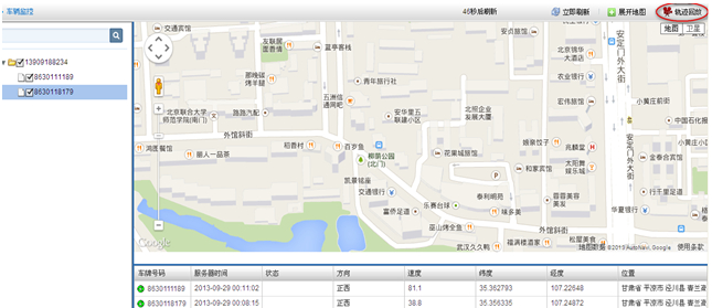 监控管理:可实时监控车辆的经纬度,速度,位置,状态等。并且可以对某一个时段的行驶轨迹进行历史轨迹回放。如下图: