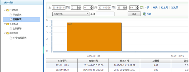 统计报表:以图形和文字的形式展现车辆的行驶报表,里程报表,报警报表及油耗报表。如下图: