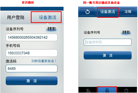 再次激活其他设备时,可以用上述激活的方法,也可以用已经有的账号(激活的手机号码)及密码登录到手机端软件上,在“设备激活”处扫描新的设备序列号,点击激活就可以了。如下图