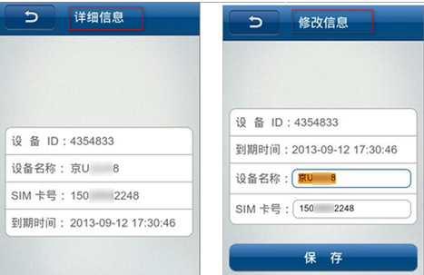 设备管理:对已经激活的设备进行查看详细信息(设备ID,设备名称,SIM卡号,到期时间等), 并可对设备的设备名称,sim卡号码进行修改。