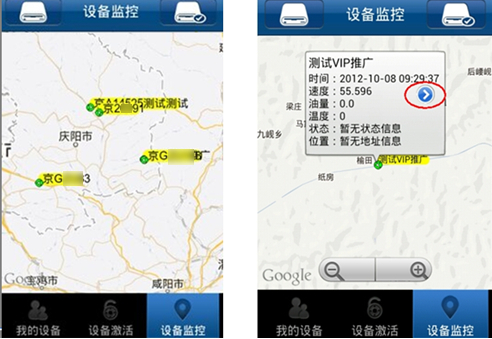 设备监控:在google地图和web版地图显示车辆的实时位置,速度,温度,油量等详细信息。