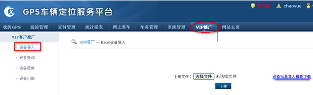 供应商在车辆定位服务平台,vip推广模块,将设备批量导入,导入资料包含设备的型号,sim卡号码,设备id,激活后的有效期等。用户可按照系统提供的模板下载填写后导入,如下图