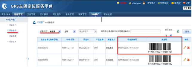 示例:供应商查询未激活的设备,可以查看此设备的sim卡号码、设备id,厂家、设备序列号。如果是出库给经销商处的设备,还可以看到此设备现所属哪个经销商。