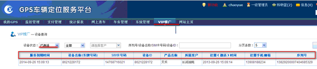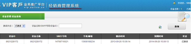 查询已激活的设备,查询的结果是设备的服务到期时间,sim卡号码,设备id,由哪个经销商售出,最终用户激活时的手机号码(邮箱)、此设备的序列号等。