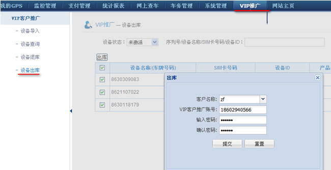 先在GPS车辆定位服务平台监控管理模块增加一个客户(及经销商)。然后在vip推广模块的设备出库中,选择要出库的设备(可一次多选),点击“出库”按钮,弹出设备出库对话框。选择所属客户(经销商),填写经销商的手机号码及密码(供应商可以先预定一个密码来填写)。点击“提交”及出库给了经销商。