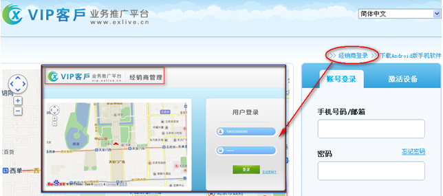 经销商用供应商处获得到的账号密码登录vip客户业务推广平台(vip.exlive.cn), 选择经销商登录,如下图